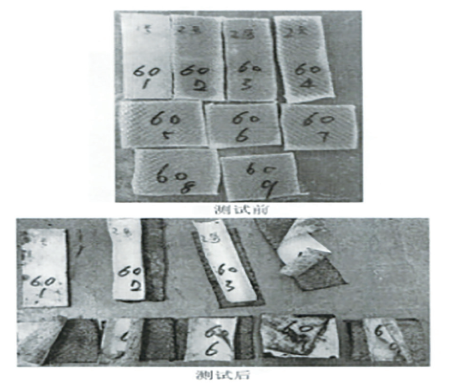 分析原因: 1號試件的敷膜層為改性PVC,與滌綸纖維之間的親和力要好于敷膜層為改性PE的試件;在開(kāi)放條件下四周熱水不規則地侵蝕質(zhì)量標準難統一的試件也是造成敷膜層與編織層剝離的因素;改性PE材料熱穩定性差,熱膨脹比大也是因素之一。
