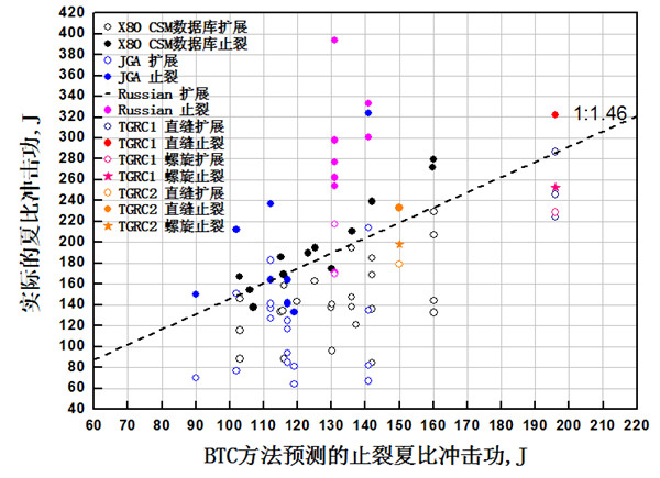 將BTC方法應用于中俄東線(xiàn)氣質(zhì)組分(表 3),計算溫度取0 ℃,計算結果(圖 7)表明,中俄東線(xiàn)氣質(zhì)組分存在明顯的減壓波平臺,止裂韌性CVN計算值為167.97 J。由于BTC方法止裂韌性計算值超過(guò)100 J,因此必須進(jìn)行修正。其中修正系數的確定來(lái)源于X80全尺寸爆破試驗數據庫。目前國際上通用的全尺寸爆破試驗數據庫如圖 8所示[14,15],由此確定的中俄東線(xiàn)1 422 mm X80管道止裂韌性修正方法為T(mén)GRC2,修正系數為1.46。經(jīng)過(guò)1.46倍的線(xiàn)性修正,將止裂韌性指標確定為245 J。需要指出的是,計算并修正后得到的245 J是止裂概率為100%的單根鋼管的韌性要求值。參考美國DOT 49 CFR Part 192的規定,裂紋能在5~8根鋼管止裂,對應的止裂概率達到95%和99%即可。按照這一原則,止裂韌性指標確定為245 J應該是偏于保守和安全的。