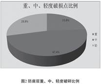 從圖2可以看出, 防腐層中度破損點(diǎn)占到總數的47.4%, 說(shuō)明雖然部分管道投產(chǎn)時(shí)間較長(cháng),但防腐層老化狀況尚可接受, 管道防腐層總體情況良好。