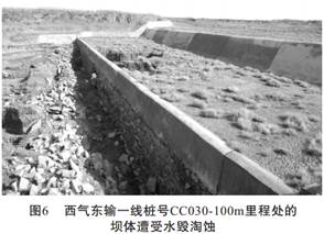 西氣東輸管道在多處河道、 沖溝中以埋入方式通過(guò), 洪水沖毀保護管道的建筑物的情況每年都有發(fā)生。 圖6為管線(xiàn)在溢流壩體上游穿越通山溝河, 管道埋入河道2~3m, 河道寬80~90 m, 管線(xiàn)下游設置兩道溢流壩。 目前第二級溢流壩由于水毀已形成較大面積的塌陷, 壩體嚴重受損, 壩前鉛絲石籠已毀壞, 失去對洪水的消能作用。 若不采取修復加固工程, 則對壩體上游的管線(xiàn)安全產(chǎn)生危害作用。