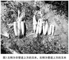 據農田承包者說(shuō), 油氣管道上方的地澆水后積水不滲。 調查組看到, 這里的玉米長(cháng)得稀疏低矮、 玉米棒小、 嚴重缺粒(圖3) 。