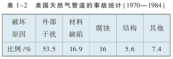W. Kent Muhlhaue:指出管道失效的原因主要有設計原因、操作原因、腐蝕原因和第三方破壞。在管道失效的事故統計數據中,由于第三方破壞而造成的管道失效占有很大的比例。表1-1和表1-2為歐洲和美國天然氣管道的事故統計分析。從表中可以看出,管道第三方破壞已成為管道失效的主要原因。