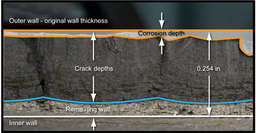 因此,NTSB得出結論,由于多個(gè)應力腐蝕裂紋增長(cháng)并結合在一起形成的腐蝕疲勞裂紋造成6B管線(xiàn)在正常操作壓力下發(fā)生破裂,這些裂紋起源于剝離的聚乙烯膠帶防腐層下方的外腐蝕區域。