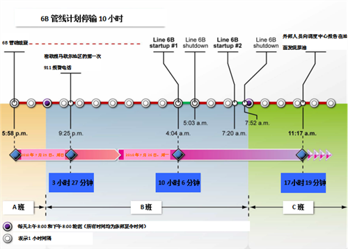 與6B管線(xiàn)操作直接相關(guān)的Enbridge公司調度中心人員,超過(guò)17個(gè)小時(shí)都沒(méi)有發(fā)現管道已經(jīng)破裂,而是認為在此期間管道中存在液柱分離(column separation),管道應該重新啟輸。17小時(shí)后,調度中心接到1名煤氣公司技術(shù)員的電話(huà),報告發(fā)現地面上有原油。