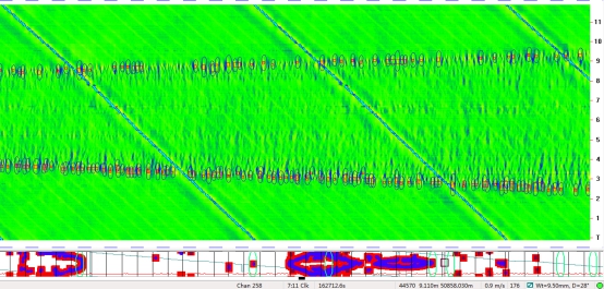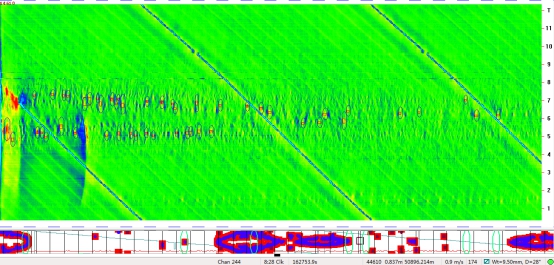 (2)位于首站出站50 890.035 m處前后,內檢測信號顯示連續6根管節存在1 072處內腐蝕缺陷,且缺陷的時(shí)鐘分布特征也顯示為積水腐蝕。其下游的44620-44670段6根管節44 m范圍內也存在532處內腐蝕缺陷,且內腐蝕均分布在5:00~7:00時(shí)鐘范圍內。與50 322 m處的內腐蝕類(lèi)似,該管段也呈現出較典型的建設期試壓水導致的內腐蝕特征。內檢測信號部分截圖如圖2所示。