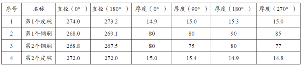 (備注:表中皮碗或鋼刷直徑為垂直兩個(gè)方向測量數值,皮碗或鋼刷厚度為垂直兩方向所在四個(gè)點(diǎn)皮碗或鋼刷的邊沿測量數值)