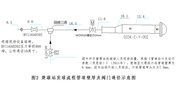 根據壓力趨勢監控,清管器發(fā)送的壓差達到0.71MPa,在取清管器時(shí)反映清管器卡的很緊,最后只能用千斤頂一點(diǎn)一點(diǎn)地移動(dòng)才將其取出。此次發(fā)送的6#清管器的皮碗及鋼刷直徑為268~275mm,而發(fā)球流程管道壁厚最窄處僅240mm(見(jiàn)圖2),MOV016球閥通徑為252mm, 過(guò)盈量較大,達到9.1%,導致清管器在管道中遇到變徑及其他情況時(shí)極易卡阻。