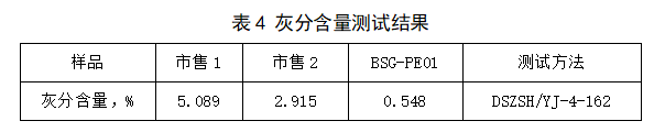 對上述各樣品進(jìn)行了灰分含量測試,結果見(jiàn)表4。