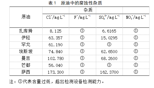 原油中的硫、酸等高分子有機腐蝕性雜質(zhì)在溫度高于220 ℃時(shí)才會(huì )對金屬材料構成腐蝕[3],管輸條件下對管道造成腐蝕的主要是低分子無(wú)機腐蝕性雜質(zhì)。對扎庫姆原油、伊朗輕油等原油的腐蝕性雜質(zhì)分析測試(見(jiàn)表1)表明,原油中的腐蝕性雜質(zhì)主要為氯化物、氟化物、硫酸鹽和硝酸鹽。此外,某些原油中還溶解有一定量的硫化氫、二氧化碳等腐蝕性氣體,這些氣體也會(huì )溶解到原油析出水中,進(jìn)一步加劇管道的腐蝕。