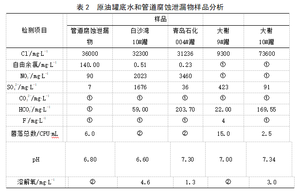 經(jīng)對原油罐底水和管道腐蝕泄漏物進(jìn)行樣品分析(見(jiàn)表2),判斷在管道輸送過(guò)程中,原油中的水溶性腐蝕雜質(zhì)向原油析出水中溶解、濃縮,形成高礦化度水,在管道中聚集,從而造成管道腐蝕。腐蝕泄漏管道初期泄漏物分析表明,管道泄漏物與罐底水類(lèi)似,均為高礦化度水,其氯離子含量最高達7%(w,質(zhì)量分數),但細菌含量總體不高,可能是罐底水中的自由余氯一定程度上抑制了細菌的生長(cháng)。測試還表明,罐底水中還含有一定的溶解氧,氧的存在進(jìn)一步加劇了管道的腐蝕。