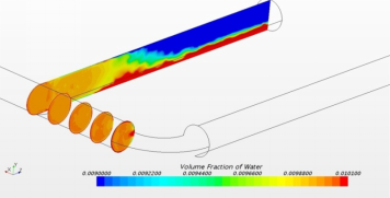 從管道中的油水兩相體積分布云圖(見(jiàn)圖4)可以看出,入口端管道直管段內,油中的水基本可以被油直接帶走,未出現明顯的油水分層現象。但在彎頭位置,離心力作用將水甩到管道外側,使管道外側的水含量明顯增多。在盲管段,油和水發(fā)生分層,管道底部出現水沉積,三通管口1.5~2 m距離往后流速很低,盲管深處速度幾乎為零,水沉積現象更為明顯。