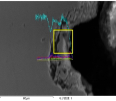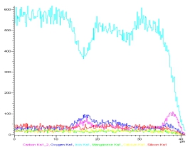 對某站場(chǎng)發(fā)生內腐蝕泄漏的管道進(jìn)行了切割制樣,宏觀(guān)觀(guān)察發(fā)現為管道底部?jì)缺邳c(diǎn)蝕,掃描電鏡下顯示為垢下腐蝕形貌。EDX分析表明,管道腐蝕坑內的垢物主要由碳、鐵、氧、錳、硅、鈣等元素組成,越靠近腐蝕坑底,垢物中的氧含量越高,鐵含量相應降低,管道腐蝕產(chǎn)物主要為鐵的氧化物(見(jiàn)圖3)。由此可以看出,原油輸管道內腐蝕為有氧環(huán)境中高礦化度水造成的電化學(xué)腐蝕。