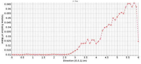 從積水段管道底部水延管程分布曲線(xiàn)(見(jiàn)圖5)可以看出,盲管段0~2.7 m處水的體積分數為1.0%左右,表明水基本被油帶走,未出現沉積,但從三通管口2.8 m的距離往后,因流速很低水開(kāi)始沉積,水的體積分數開(kāi)始升高,最高可達6.5%,表明盲管中存在明顯的水沉積現象。