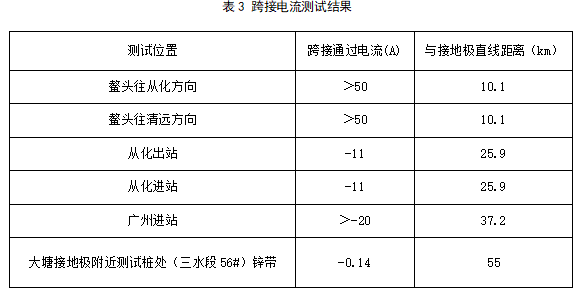 為綜合確定干擾程度,分別對站場(chǎng)絕緣接頭跨接處的電流進(jìn)行檢測,表3為魚(yú)龍嶺接地極陰極放電3000A時(shí)的檢測結果。