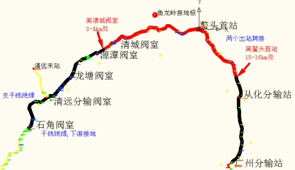 圖1 高壓直流輸電接地極與廣東管網(wǎng)管道相對位置圖
