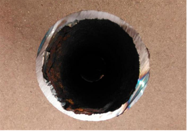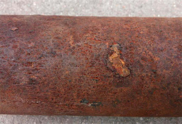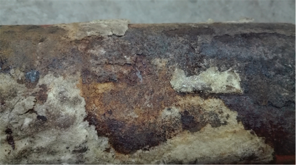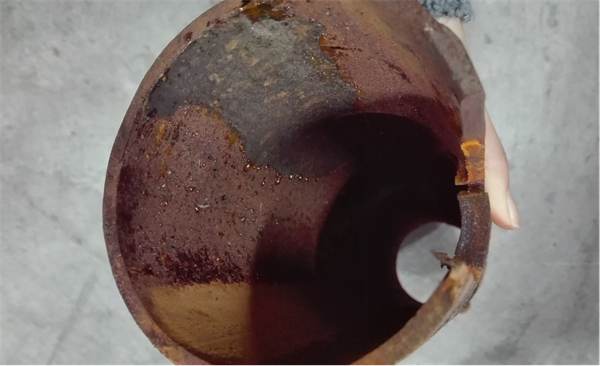 經(jīng)過(guò)對鋼管內外表面及端面的檢測,均未發(fā)現腐蝕坑、壁厚減薄、穿孔等現象,管道仍舊保持原先的表面質(zhì)量和幾何尺寸,未發(fā)生普遍均勻腐蝕現象,可見(jiàn)“環(huán)氧粉末+黃夾克”防腐結構起到了良好保護效果。但外防腐層脫落部位,鋼管外表面有腐蝕現象發(fā)生,腐蝕層均勻(如圖1所示)。管道內壁未發(fā)現腐蝕坑、穿孔等現象,腐蝕產(chǎn)物均勻分布,屬全面腐蝕的類(lèi)型(如圖2所示)。