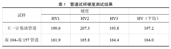 2段管道試樣的硬度測試結果見(jiàn)表1。