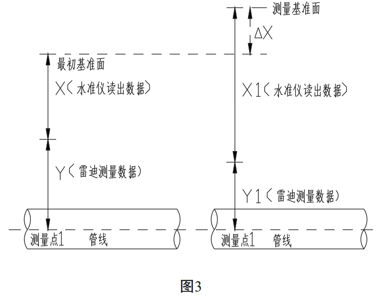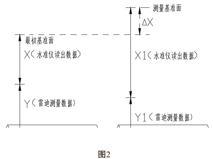 (1)同一測量點(diǎn)進(jìn)行下次測量時(shí),如果所選擇測量基準面較最初基準面低,△X為基準面的差值,通過(guò)現場(chǎng)實(shí)際測量確定。如圖2: