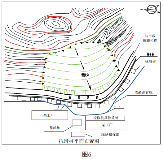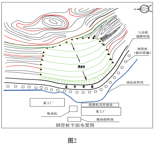 廣東順德某成品油管道繞飛鵝山腳呈等高線(xiàn)敷設。 2008年6月30日, 由于受連續多天強降雨的惡劣天氣影響, 山腰出現多處裂縫, 裂縫的寬度和數量不斷擴大和增多, 山腳已開(kāi)始形成小面積的滑坡。 管道前方的廠(chǎng)房建筑物出現大面積開(kāi)裂和倒塌。 經(jīng)初步測量, 滑坡體積約為3萬(wàn)立方, 滑坡面處于管道上方約12米的位置, 滑坡體腳址位于管道前20米位置, 若不快速采取有效措施, 滑坡體下滑的外力將加劇對成品油管道的推移,導致管道變形、 斷裂和成品油大量泄漏, 危及周?chē)罕娚敭a(chǎn)安全, 破壞周邊的生態(tài)環(huán)境。 (見(jiàn)圖 1)