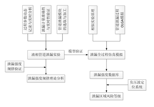 本文主要采用理論研究、模擬實(shí)驗以及數值仿真相結合的方法,根據東黃復線(xiàn)沿線(xiàn)站點(diǎn)分布進(jìn)行分段,并對各站點(diǎn)之間的管道依據其高程變化進(jìn)行劃分,研究其泄漏規律,對現有的管道泄漏模型進(jìn)行驗證,改進(jìn)泄漏強度計算模型,并在此基礎上研究泄漏過(guò)程中可能進(jìn)行的保壓運行、停泵等泄漏處置干預過(guò)程對泄漏強度的影響,分析不同泄漏場(chǎng)景和工況下的泄漏規律,總結出相應的泄漏強度的計算方法,最終得出泄漏量的大小。主要技術(shù)路線(xiàn)如圖2所示。