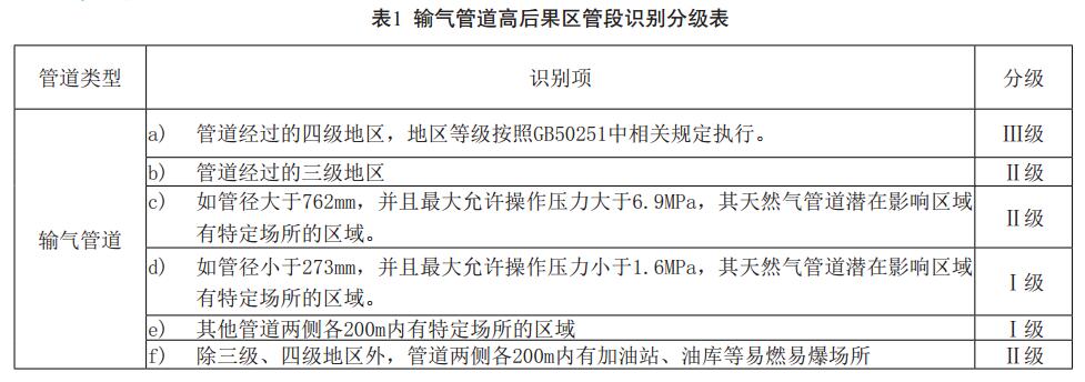 規范中規定的輸氣管道高后果區識別管段分級見(jiàn)表1。