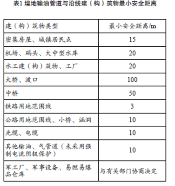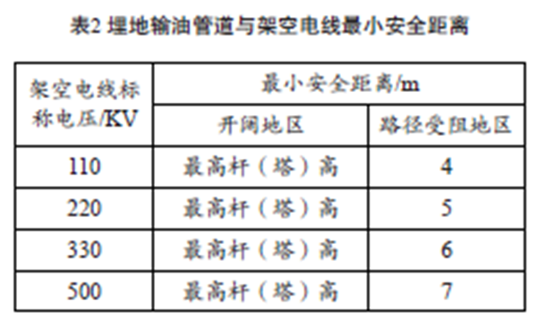 油氣管道沿線(xiàn)難免會(huì )有鐵路、公路、房屋等建(構)筑物,不同類(lèi)型的建(構)筑物與管道的最小安全距離不同,相關(guān)標準除上述提到的兩項之外,還包括:《埋地鋼質(zhì)管道陰極保護技術(shù)規范GB/T 21448—2008》《鋼質(zhì)管道外腐蝕控制規范GB/T 21447—2008》《關(guān)于處理石油管道和天然氣管道與公路相互關(guān)系的若干規定(試行) 》《原油、天然氣長(cháng)輸管道與鐵路相互關(guān)系的若干規定》《110~500kV 架空送電線(xiàn)路設計技術(shù)規程》(DL/T 5092—1999)。埋地原油、成品油管道與沿線(xiàn)建 (構)筑物安全距離如表1所示,管道與沿線(xiàn)高壓電力線(xiàn)安全距離如表 2 所示,敷設在地面的輸油管道與沿線(xiàn)建(構)筑物安全距離應按表 1、表 2所示加倍。