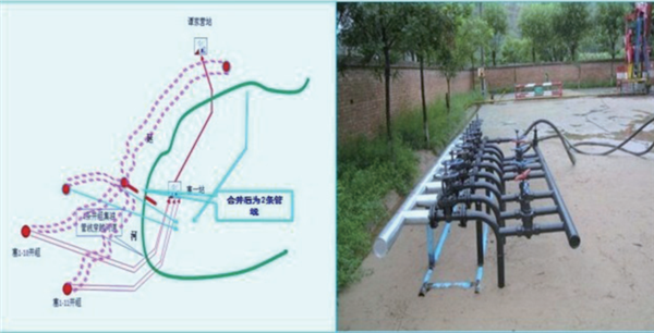 創(chuàng )新管道管理工藝。對位于安塞縣建華寺鎮的5處10條穿河管道進(jìn)行了重點(diǎn)治理。按照管道穿河治理原則,作業(yè)區對塞1-231等5個(gè)井組管線(xiàn)予以合并,將5條穿越河道的管道整合成1處,在塞1-231井組設立獨立的管道總機關(guān)進(jìn)行管理。通過(guò)實(shí)施合并管理工藝,將管道穿越河道的風(fēng)險由以前的10條降低為2條,同時(shí)減少了10條老化管道。管線(xiàn)合并后,既不影響原油生產(chǎn),又消減了管道穿越河道的環(huán)保風(fēng)險(如圖4所示)。