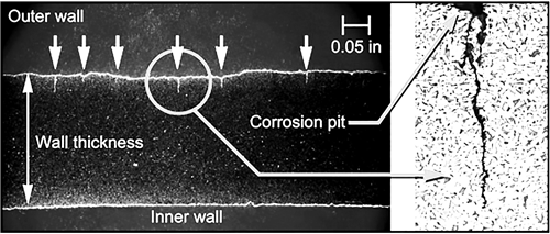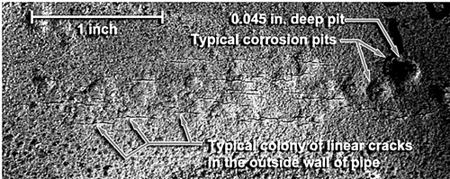 管體表面可以見(jiàn)到腐蝕坑,通過(guò)磁粉探傷可以觀(guān)察到管道外壁細小的線(xiàn)性裂紋。