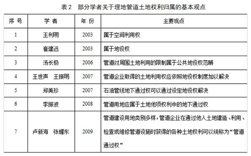 油氣管道項目特殊用地方式的權利歸屬一直存在著(zhù)爭議,表2列出了一些學(xué)者的基本觀(guān)點(diǎn)。