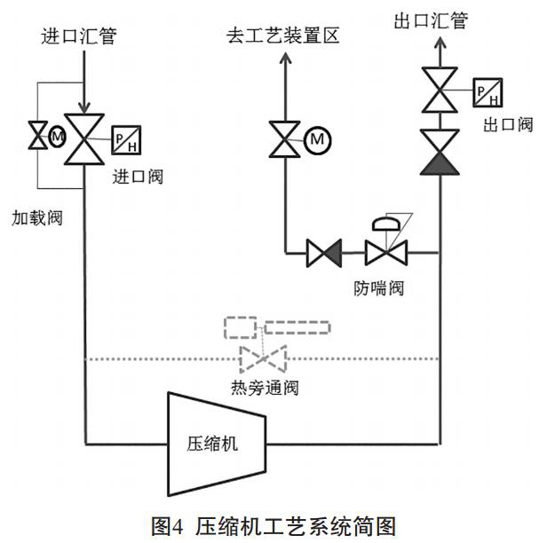 現在,壓縮機工藝系統的設計主要采用集中空冷方式,壓縮機防喘振回路氣體沒(méi)有接到壓縮機的入口管線(xiàn),而是接到了工藝裝置區,如圖4所示。如果壓縮機進(jìn)出口閥門(mén)使用了快速關(guān)閉型閥門(mén),而沒(méi)有安裝熱旁通閥,是存在安全隱患的。