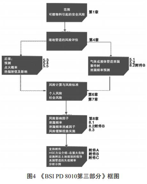 《 BSI PD 8010第三部分》提供風(fēng)險評估導則的輸送可燃介質(zhì)管道,也是《管道安全法》規定需要開(kāi)展安全分析的重大危害管道,但并沒(méi)有包括輸送有毒介質(zhì)的管道。第三部分內容框圖如圖4所示。