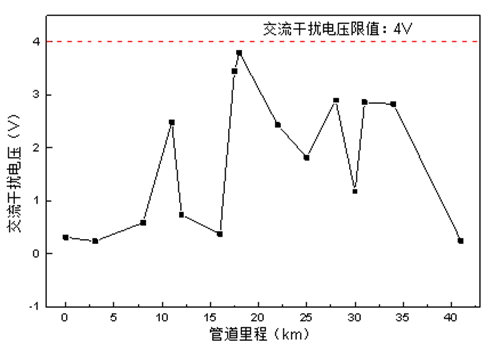 圖 3 緩解后管道沿線(xiàn)交流干擾分布
