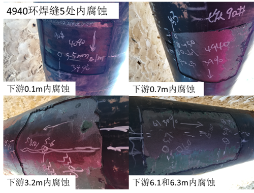 環(huán)焊縫編號為4940的下游管節有5處內腐蝕驗證,具體信息如表2所示,將內腐蝕缺陷附近的涂層去除,去除過(guò)程中發(fā)現防腐層存在部分剝離情況,在4:00-6:45位置防腐層剝離,其他位置防腐層粘結良好。將表面打磨到可測量狀態(tài)后,采用MT150超聲測厚儀測量管體的厚度,無(wú)缺陷處的管體厚度為6.4mm,5處缺陷位置的驗證測量情況如圖3所示,位于4940環(huán)焊縫下游0.1m處的內腐蝕缺陷測量壁厚最小值為5.5mm減薄14%,位于管道周向的5:30位置。位于4940環(huán)焊縫下游0.7m處的內腐蝕缺陷測量壁厚最小值為5.0mm減薄22%,位于管道周向的6:15位置。位于4940環(huán)焊縫下游3.2m處的內腐蝕缺陷測量壁厚最小值為5.6mm減薄13%,位于管道周向的6:00位置。位于4940環(huán)焊縫下游6.1m處的內腐蝕缺陷測量壁厚最小值為5.7mm減薄11%,位于管道周向的5:45位置。位于4940環(huán)焊縫下游6.3m處的內腐蝕缺陷測量壁厚最小值為5.4mm減薄16%,位于管道周向的5:45位置。