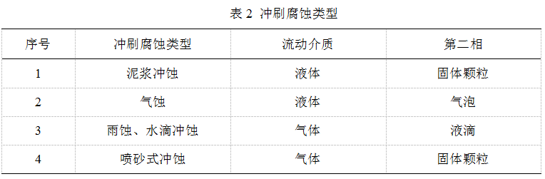 沖刷腐蝕(Erosion-Corrosion)[1]是金屬表面與腐蝕流體之間由于高速相對運動(dòng)而引起的金屬損壞現象,是材料受沖刷和腐蝕協(xié)同作用的結果。根據介質(zhì)可將沖蝕磨損分為兩大類(lèi):氣液噴砂型沖蝕及液流或水滴型沖蝕[2]。流動(dòng)介質(zhì)中攜帶的第二相可以是固體粒子、液滴或氣泡,它們有的直接沖擊材料表面,有的則在表面上潰滅(氣泡),從而對材料表面施加機械力。如果按流動(dòng)介質(zhì)及第二相排列組合,則可把沖蝕磨損分為四種類(lèi)型[3],如表2所示。