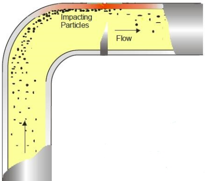 砂含量是沖刷腐蝕的主控因素之一。砂礫在管道內隨氣液介質(zhì)流動(dòng),遇到彎頭時(shí)流動(dòng)狀態(tài)發(fā)生劇烈變化。砂礫沖擊管壁后因慣性作用將沿管壁繼續向前流動(dòng),如圖2所示。