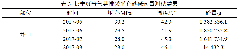 使用“非侵入式砂含量測試技術(shù)”測得長(cháng)寧頁(yè)巖氣某排采平臺集輸系統砂含量變化,如表3所示。