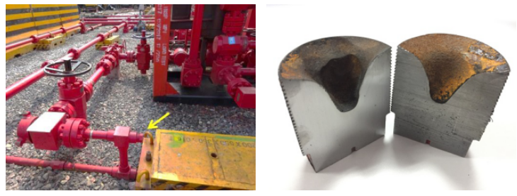 長(cháng)寧頁(yè)巖氣主要表現為噴砂式?jīng)_蝕,即高流速高砂量介質(zhì)直接沖擊集輸系統管壁,導致其短時(shí)間內減薄穿孔。