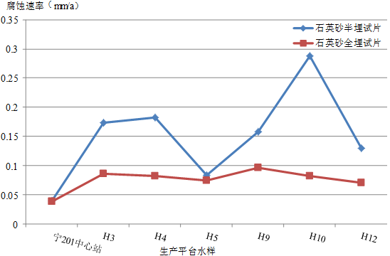 (2)試片在H3、H4、H9、H12生產(chǎn)平臺水樣中,出現了嚴重腐蝕。