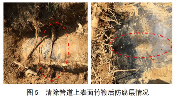 (2)開(kāi)挖點(diǎn)4現場(chǎng)調查情況。開(kāi)挖點(diǎn)4的楠竹距離管道僅10 cm,開(kāi)挖后發(fā)現有三根竹鞭(直徑約3 cm)直接壓在管道上表面(圖 4),壓力較大,需用力才能將竹鞭拉離管道表面。清除竹鞭后,對防腐層進(jìn)行100%目測檢查,發(fā)現管道表面有細微壓痕,防腐層暫未破損(圖 5)。