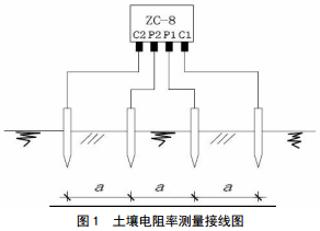 ①在測量點(diǎn)使用接地電阻測量?jì)x(常用儀器為ZC-8,誤差不大于3%),采用四極法進(jìn)行測試,測量接線(xiàn)見(jiàn)圖 1。