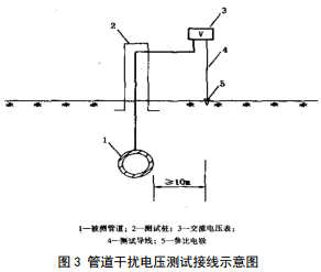 測量?jì)x表應具有防電磁干擾性能。參比電極可采用鋼棒電極、硫酸銅電極。采用鋼棒電極時(shí),其鋼棒直徑不宜小于16 mm,插入土壤深度宜為100 mm。參比電極應豎直布置,與埋地金屬管道之間的距離應大于10 m。每次測試時(shí),參比電極位置宜保持一致。參比電極設置處,地下不應有冰層、混凝土層、金屬及其他影響測試的物體。土壤干燥時(shí),應濕潤地面。按圖 3接好測試線(xiàn)路,然后直接記錄測試值。