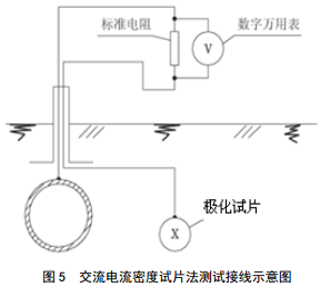 采用極化探頭或試片測試交流電流密度,利用標準電阻測量管道和試片間的連接電纜中的交流電流,除以測試試片的面積,即為交流電流密度(圖 5)。