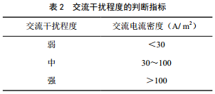 結合以上數據,通過(guò)計算或實(shí)測得到交流電流密度,判斷腐蝕風(fēng)險。管道受交流腐蝕風(fēng)險可按表 2確定。對于交流電流密度大于30 A/m 2的位置應重點(diǎn)關(guān)注。