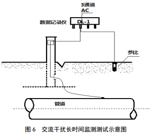 對于交流干擾電壓劇烈波動(dòng)或交流干擾嚴重管段,進(jìn)行24 h交流干擾電壓監測。按照圖 6的接線(xiàn)方式連接,記錄管道的24 h交流電壓。根據管道沿線(xiàn)土壤電阻率、交流電壓大小及波動(dòng)情況,評價(jià)交流干擾的嚴重程度。