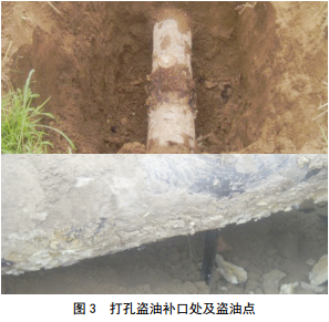 某采油廠(chǎng)原油外輸管道輸差波動(dòng)較大,懷疑管道存在腐蝕穿孔或有不法分子打孔盜油,多次巡查現場(chǎng)沒(méi)發(fā)現問(wèn)題。采用防腐層破損點(diǎn)查找技術(shù)沿管道敷設軌跡進(jìn)行破損點(diǎn)查找,共發(fā)現27處破損點(diǎn)。對其全部開(kāi)挖驗證:其中22處為歷年來(lái)發(fā)生打孔盜油的補口位置, 4處為外防腐層破損點(diǎn), 1處為不法分子打孔盜油點(diǎn)(圖 3)。