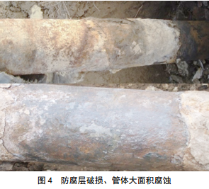 2016年6月,檢測油田本部某采油廠(chǎng)注水管道,在利用埋地管道防腐層檢測儀對防腐層進(jìn)行檢測評估時(shí),根據檢測異常數據開(kāi)挖驗證,發(fā)現管道防腐層破損、管體腐蝕嚴重(圖 4)。根據檢測結果提出建議:更換管段10 m,防腐層大修。