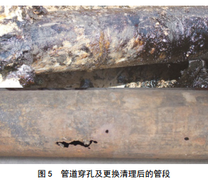 某采油廠(chǎng)低含水原油外輸管道1999年10月投產(chǎn),管道規格Φ 159×6、材質(zhì)20#鋼,工作壓力0.9 MPa、工作溫度70 ℃,近年來(lái)管道穿孔頻繁。使用管道防腐層檢測儀配合“A”支架檢測防腐層絕緣性能時(shí),發(fā)現一處破損點(diǎn),經(jīng)開(kāi)挖驗證為管道現場(chǎng)穿孔(圖 5)。使用單位及時(shí)進(jìn)行了維修處理,避免了更大的經(jīng)濟損失和安全風(fēng)險。