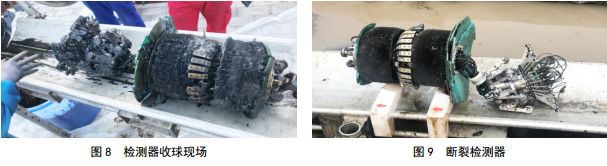 2018年9月21日08:10發(fā)送漏磁檢測器,9月21日16:15監聽(tīng)到漏磁檢測器到達末站收球筒。運行里程35.3 km,運行時(shí)間共計8 h 5 min。打開(kāi)盲板后,前皮碗破損嚴重,后皮碗和尾翼狀況良好,具有較強的驅動(dòng)能力。檢測器幾何節斷裂,前段漏磁節和幾何節(前半部分)順利收出,幾何節(后端)和IV節以及里程輪遺落在管道內(圖 8-9)。斷裂后遺落在管道內的檢測器殘體不具備發(fā)射機功能,無(wú)法通過(guò)接收 機尋找; IV節的直徑約為146 mm,不會(huì )影響油流通過(guò)且不具備驅動(dòng)能力。