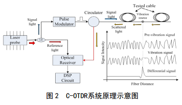 長(cháng)距離分布式光纖C-OTDR系統原理如圖2所示,窄帶激光器發(fā)射連續激光,經(jīng)過(guò)3dB耦合器將連續光分成兩路,一路光作為本振參考光,另一路光經(jīng)過(guò)脈沖調制將連續激光調制為脈沖激光輸入到被測光纖中產(chǎn)生散射光信號,將散射光信號與參考光進(jìn)行外差相干獲得被測光纖上各監測點(diǎn)的擾動(dòng)信號,從而實(shí)現被測光纜沿線(xiàn)的外界入侵監測。圖2中坐標圖分別展示了振動(dòng)源作用前、作用時(shí)及作用后的差分信號波形示意圖。振動(dòng)信號作用時(shí),作用點(diǎn)光纖前端及尾端的信號不受作用點(diǎn)信號串擾。