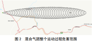 將混合氣團模擬時(shí)間點(diǎn)取至200 s,運行高斯煙團模型,得到混合氣團整個(gè)運動(dòng)危害范圍,見(jiàn)圖2。